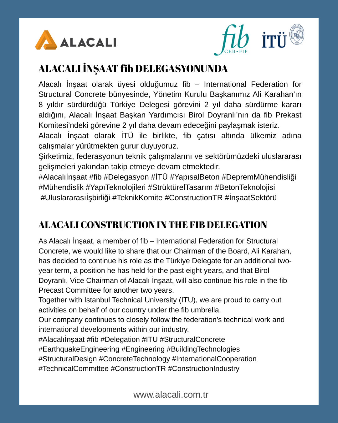 Alacalı İnşaat olarak üyesi olduğumuz fib – International Federation for Structural Concrete bünyesinde, Yönetim Kurulu Başkanımız Ali Karahan’ın 8 yıldır sürdürdüğü Türkiye Delegesi görevini 2 yıl daha sürdürme kararı aldığını, Alacalı İnşaat Başkan Yardımcısı Birol Doyranlı’nın da fib Prekast Komitesi’ndeki görevine 2 yıl daha devam edeceğini paylaşmak isteriz.